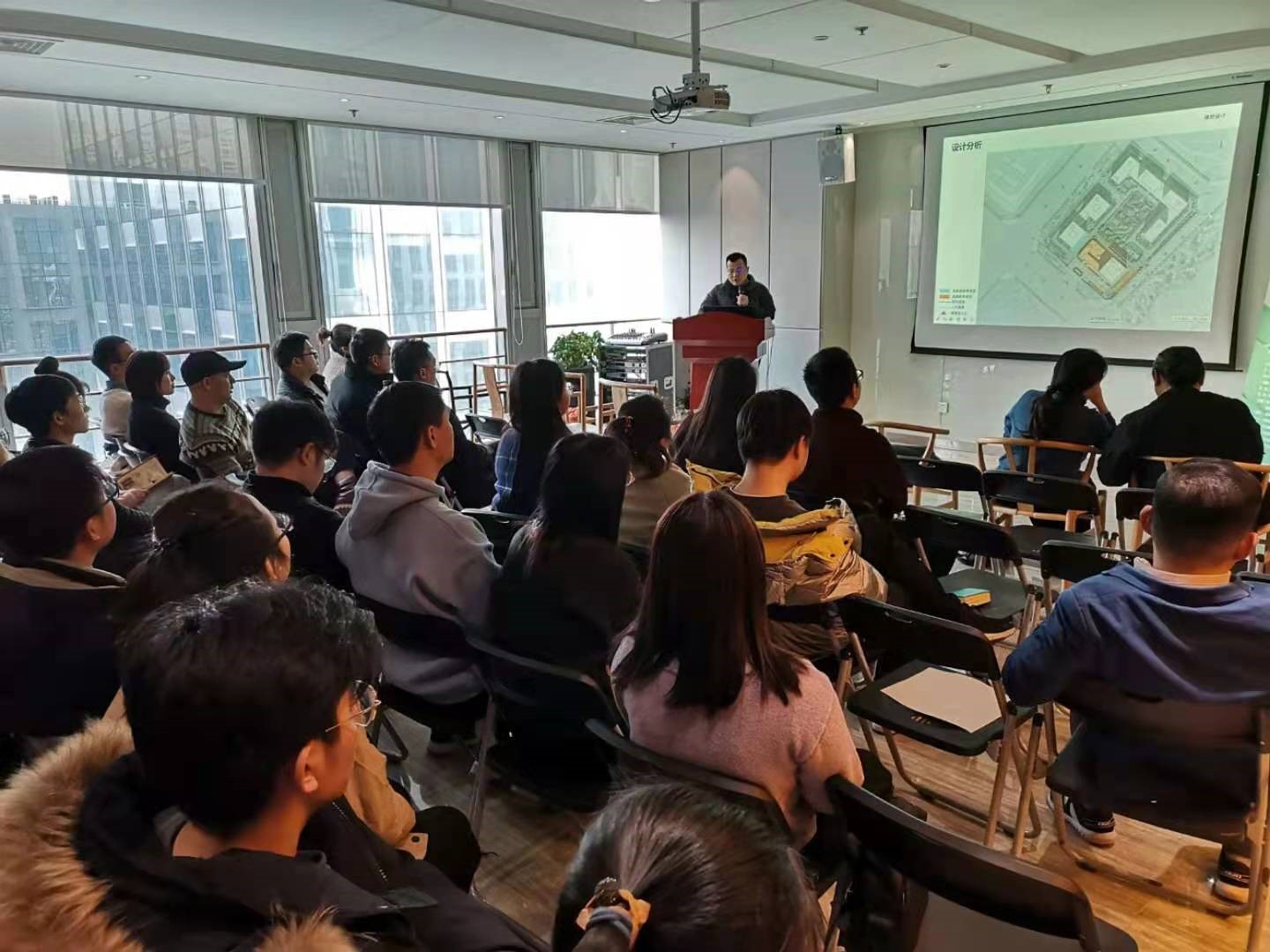 参观结束后,部分项目的设计师又分别上台详细分享了作品的创作理念、创作历程和心得体会,杨总在听了设计师们的分享后,对大家设计中的问题逐一进行了指导,同时还结合他几十年来的创作经验,分享了自己的心得,他指出青年设计师要先积累设计量,逐步培养自己的设计风格,在一定量的积累后,结合建设方需求逐步发挥自己的设计思想,抓住每一次设计机会。